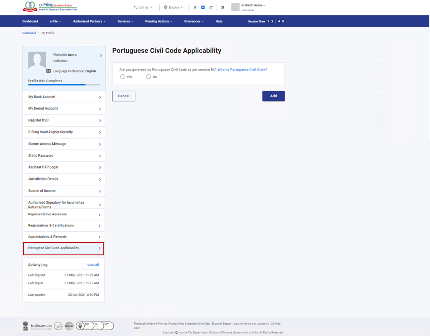 Step 1: On My Profile page, click Portuguese Civil Code Applicability.