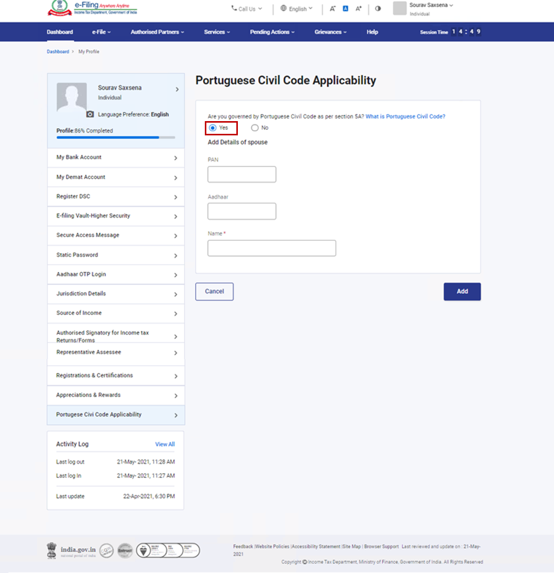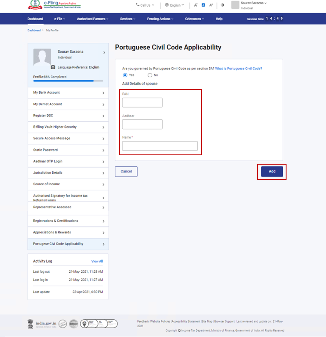 Step 3: Enter details such as PAN, Aadhaar and Name of your spouse and click Add.
