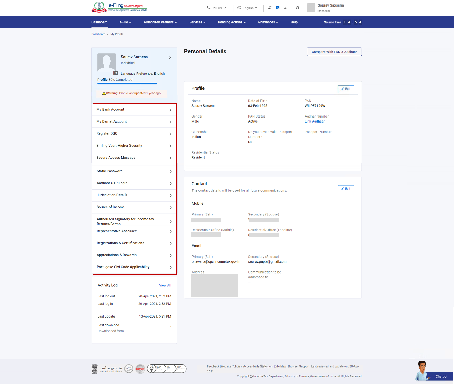 - If you update your mobile number and email ID as per Bank Details, you will receive the OTP on the primary mobile number and primary email ID respectively entered on the e-Filing portal.
