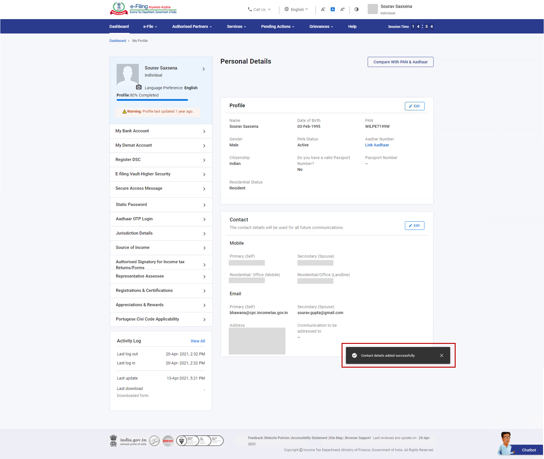 - Address: In case you only update address details (as per PAN / Aadhaar), no OTP authentication will be required. On successful updation of the address an email will be sent to you on the primary email ID registered on the e-Filing portal.