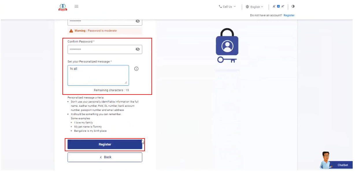 चरण 8: पासवर्ड सेट करें पेज पर, पासवर्ड सेट करें और पासवर्ड की पुष्टि करें टेक्स्टबॉक्स दोनों में अपना वांछित पासवर्ड दर्ज करें और पंजीकृत करें पर क्लिक करें।