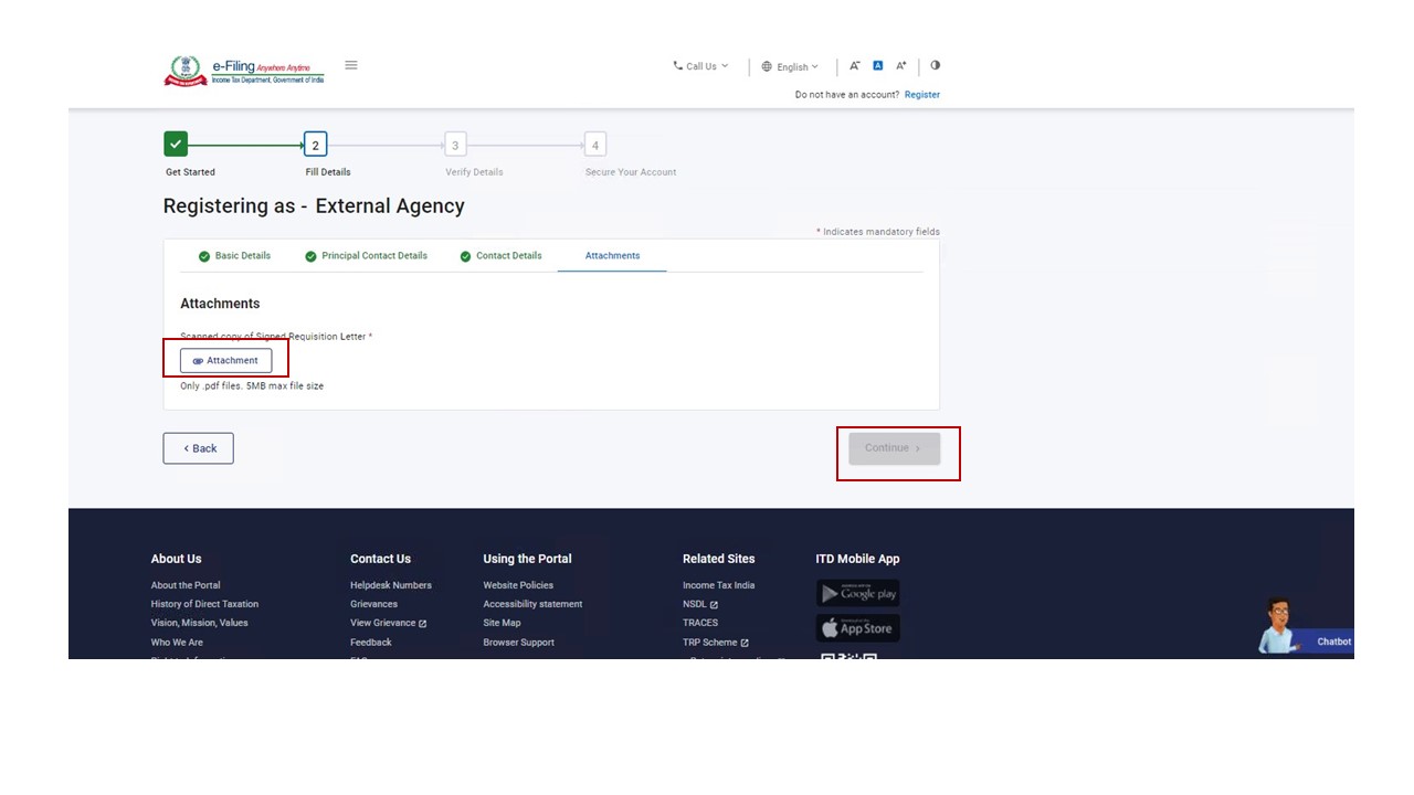 चरण 3: मूल-भूत ब्यौरा पेज पर एजेंसी का प्रकार, संगठन का TAN/PAN, संगठन का नाम और DOI सहित सभी अनिवार्य विवरण दर्ज करें और जारी रखें पर क्लिक करें।